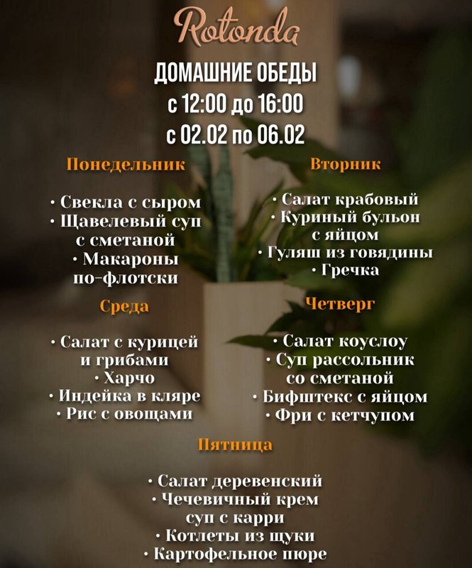 Очень понравилась общая атмосфера в заведении: уютно, доброжелательно, тихо, прилично, культурно, спокойно и ненавязчиво. Сотрудники отлично обслуживали, всё было вовремя. Изначально выбирали что-то ближе к природе, чтобы была возможность выйти на воздух. В "Ротонда" были впервые, очень всё понравилось, думаю, что и второй, и третий раз ещё придём!